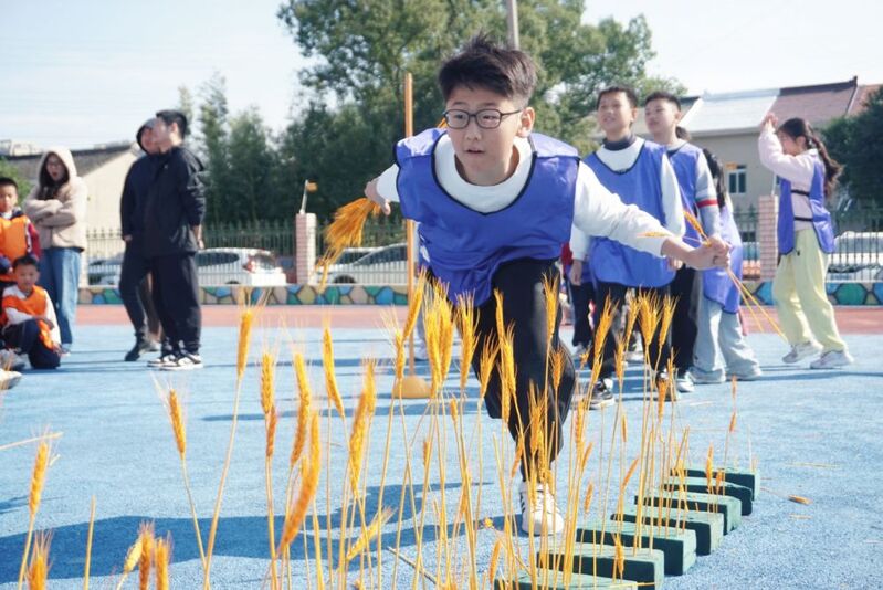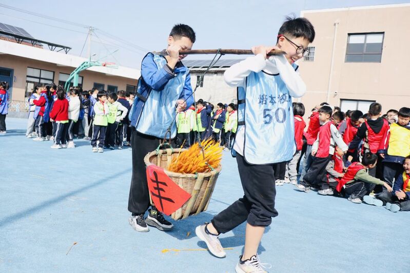 除了50米跑、坐位體前屈、一分鐘跳繩、仰臥起坐、8×50米等傳統體測達標項目,“同心挑金秋”“拾麥趣接力”“齊心巧速遞”三大趣味項目將農耕場景搬入校園,成為本次運動會的亮點。