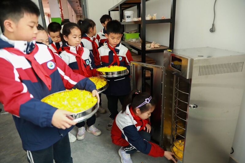 當親手采摘、清洗、挑選的菊花被送入烘干機時,期待感瞬間拉滿。孩子們圍在機器旁,搓著小手,眼神里充滿了好奇與興奮,紛紛猜測著烘干后的菊花會變成什么模樣。“我的菊花會不會最香?”“它們縮水后會變得多小?”……這些源自實踐的疑問,正是最寶貴的科學探究火花。