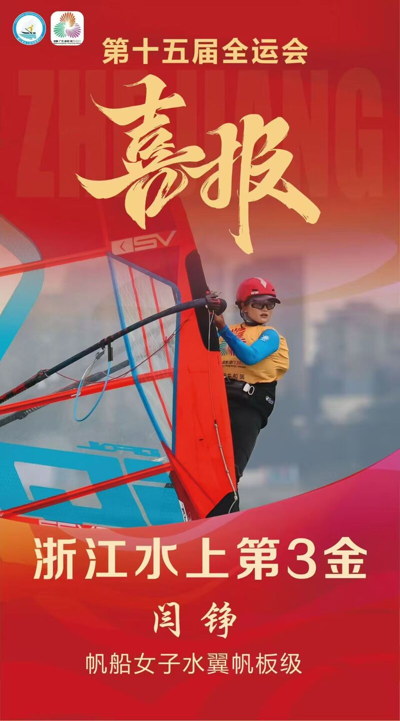 10月30日上午結束的第十五屆全國運動會帆船帆板比賽中,鄞州運動員閆錚代表浙江隊在女子水翼帆板級比賽中勇奪冠軍,為浙江代表隊在本屆全運會上斬獲第三枚水上項目金牌,同時也是鄞州區在本屆全運會競技項目上獲得的首枚金牌!值得一提的是,這是閆錚第二次榮獲全運會冠軍,在2021年第十四屆全運會上,閆錚曾奪得女子帆板RS:X級長距離賽和障礙滑全能比賽冠軍。